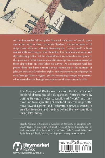 As the dust settles following the financial meltdown of 2008, more and more media outlets, corporate "leaders," and economists of all stripes have taken to endlessly discussing the "new normal"-a labor market with lower wages, fewer benefits, less democracy at work, and skyrocketing profits. Yet far too seldom is any consideration given to the question of what these new conditions of precariousness mean for those dependent on their labor to survive. As contingent work has grown there has been a simultaneous reduction in the number of jobs, an erosion of workplace rights, and the evaporation of past gains won through labor struggles, yet these sweeping changes are presented as inevitable and benign consequences of of the economic crisis. The Meanings of Work aims to explore the theoretical and empirical dimensions of this question. Antunes starts by putting forward a wider conception of "work," and then moves on to analyze the philosophical underpinnings of the move toward Fordism and Taylorism in previous epochs in an effort to understand the drive behind the new conditions facing labor today.