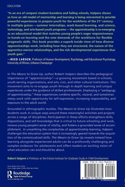 In The Means to Grow Up, Robert Halpern describes the pedagogical importance of "apprenticeship"-a growing movement based in schools, youth-serving organizations, and arts, civic, and other cultural institutions. This movement aims to re-engage youth through in-depth learning and unique experiences under the guidance of skilled professionals. Employing a "pedagogy of apprenticeship," these experiences combine specific, visceral, and sometimes messy work with opportunity for self-expression, increasing responsibility, and exposure to the adult world. Grounded in ethnographic studies, The Means to Grow Up illustrates how students work in unique ways around these meaningful activities and projects across a range of disciplines. Participation in these efforts strengthens skills, dispositions, and self-knowledge that is critical to future schooling and work, renews young peoples' sense of vitality, and fosters a grounded sense of accomplishment. In unearthing the complexities of apprenticeship learning, Halpern challenges the education system that is increasingly geared towards the acquisition of de-contextualized skills. Instead, he reveals how learning alongside experienced adults can be a profoundly challenging and complex endeavor for adolescents and offers readers an exciting vision of what education can and should be about.