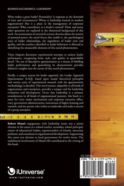 What makes a great leader? Personality? A response to the demands of time and circumstance? Where is leadership located in modern organizations? Has it a place in the management of corporate enterprise? What contributes to a leader's control? These and many other questions are explores in the theoretical background of this work. An examination of twentieth century theories about the sources of personal powers, the social forces that enabled it, the psychological roots of leader relationships, the ingredients of leader style and quality, and the conduct identified as a leader behaviors is directed at identifying the measurable elements of this social phenomenon. Three chapters document experimental attempts to analyse leader performance, recognizing form, style, and quality in quantifiable detail. The use of descriptive questionnaires as means of labeling leader performance and quantifying its characteristics provides definitive insights into the nature of this social phenomenon. Finally a unique system for leader appraisal, the Leader Appraisal Questionnaire (LAQ), based upon sound theoretical principles and twenty years of experimental research with the questionnaire methodology, is detailed. This novel system, adaptable to all kinds of organizations and enterprises, provides a unique tool for leadership evaluation and development. Given that leadership is a primary consideration in all kinds o organizational pursuits, this book is a must for every major institutional ans corporate executive office, every government administration, institutions of higher learning and research, and any person who wishes to undertake and make success of a group enterprise.