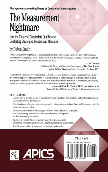 Today's competitive environment requires that companies distinguish themselves in the marketplace using factors other than prices. Companies that excel at on-time delivery, short cycle/leadtime, quality, and fast response to the market gain a competitive edge - and have the ability to market based on these features. A proven approach to achieve this is the Theory of Constraints (TOC) production solution known, as drum-buffer-rope scheduling. Just in time (JIT), Total Quality Management (TQM) and other philosophies aim at exploiting these competitive edge factors. However, accounting systems, financial, and incentive measurements continue to be the biggest stumbling blocks to companies wishing to improve their financial performance with these tools. Agreement on the need for a measurement system that encourages local actions in line with bottom line results is common, but solutions have remained elusive. Whether a company is pursuing JIT, TQM, or TOC, cost accounting is the common enemy. Attempts have been made to introduce "new" costing methods such as activity based costing and economic value added, but they have failed to recognize the basic difference between product costing for financial statement purposes and collective management information to make real time decisions. The Measurement Nightmare shows you how to resolve the conflicts and remove the accounting systems, financial, and incentive measurement roadblocks to adopting TOC, thereby gaining improved performance and sustaining competitive advantage. The techniques that the author, leading authority Debra Smith, has implemented and tracked at various companies highlight "the productivity measurement nightmare". Especially important are the day-to-day tools she developed to ensure successful implementation.