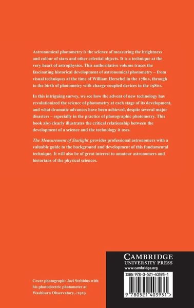 Astronomical photometry is the science of measuring the brightness and colour of stars and other celestial objects. It is a technique at the very heart of modern astrophysics. This authoritative volume traces the fascinating historical development of astronomical photometry--from visual techniques at the time of William Herschel in the 1780's, through to the birth of photometry with charge-coupled devices in the 1980's.