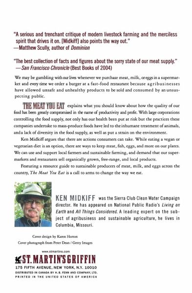 We may be gambling with our lives whenever we purchase meat, milk, or eggs in a supermarket and every time we order a burger at a fast-food restaurant, because agribusinesses have allowed unsafe and unhealthy products to be sold and consumed by an unsuspecting public. The Meat You Eat explains what you should know about how the quality of our food has been greatly compromised in the name of productivity and profit. With large corporations controlling the food supply not only has our health been put at risk but the practices these companies undertake to mass-produce foods has lead to inhumane treatment of animals, lack of diversity in the food supply, as well as put a strain on the environment. Ken Midkiff argues that there are actions consumers can take. While eating a vegan or vegetarian diet is an option there are ways to keep meat, fish, eggs and more on our plates. We can use and support local farmers and sustainable farming, and demand that our supermarkets and restaurants sell organically grown, free-range, and local products. Featuring a resource guide to sustainable producers of meat, milk, and eggs across the country, The Meat You Eat is a call to arms to change the way we eat.