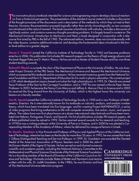Preface 1. Introduction to the mechanical universe 2. The law of falling bodies 3. The language of nature: derivatives and integrals 4. Inertia 5. Vectors 6. Newton's laws and equilibrium 7. Universal gravitation and circular motion 8. Forces 9. Forces in accelerating reference frames 10. Energy: conservation and conversion 11. The conservation of momentum 12. Oscillatory motion 13. Angular momentum 14. Rotational dynamics for rigid bodies 15. Gyroscopes 16. Kepler's laws and the conic sections 17. Solving the Kepler problem 18. Navigating in space 19. Temperatures and the gas laws 20. The engine of nature 21. Entropy 22. The quest for low temperature Appendix A. The international system of units Appendix B. Conversion factors Appendix C. Formulas from algebra, geometry, and trigonometry Appendix D. Astronomical data Appendix E. Physical constraints Selected bibliography Index.