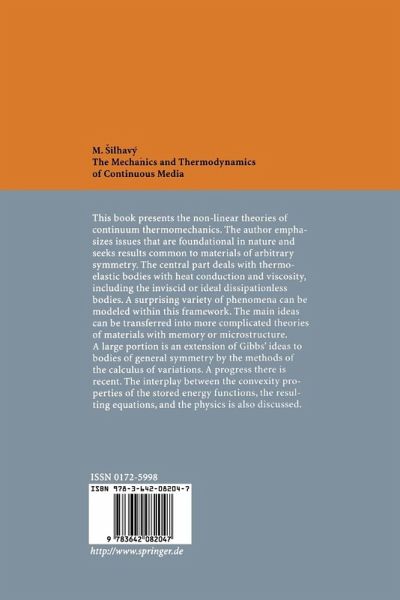 This book presents the nonlinear theories of continuum thermomechanics. Through out 1 emphasize issues that are foundational in nature, and seek results common to materials of arbitrary symmetry. The central part of the book deals with thermoelastic bodies with heat conduction and viscosity, including the inviscid or ideal dissipation less bodies. A surprising variety of phenomena can be modeled within this frame work. Moreover, the main ideas can be transferred into more complicated theories. At present, the major challenge to the non linear thermoelasticity is posed by phase transformations with changes in symmetry. 1. W. Gibbs' immensely inftuen tiaI treatise On the equilibrium of heterogeneous substances has provided a highly successful theory of phase transitions in ftuids. Gibbs brought the view that the ther modynamics is not only the theory of heat, but also a theory of equilibrium, with the of the book is an extension of main tool the minimum principles. A large portion Gibbs' ideas to bodies of general symmetry by the methods of the calculus of varia tions. The interplay between the convexity properties of the stored energy functions, the resulting equations, and the physics of the phenomena is a leading theme.