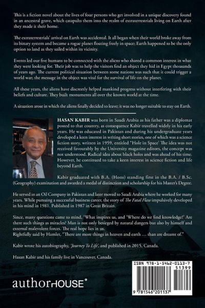 This is a fiction novel about the lives of four persons who get involved in a unique discovery found in an ancestral grave, which catapults them into the realm of extraterrestrials living on Earth after they made it their home. The extraterrestrials' arrival on Earth was accidental. It all began when their world broke away from its binary system and became a rogue planet floating freely in space; Earth happened to be the only option to land as they sailed within its vicinity. Events led our five humans to be connected with the aliens who shared a common interest in what they were looking for. Their job was to help the visitors find an object they hid in Egypt thousands of years ago. The current political situation between some nations was such that it could trigger a world war; the message in the object was vital for the survival of life on the planet. All these years, the aliens have discreetly helped mankind progress without interfering with their beliefs and culture. They built monuments all over the known world at the time. A situation arose in which the aliens finally decided to leave; it was no longer suitable to stay on Earth.