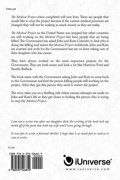 The Medical Project when completed will save lives. There are people that would like to stop the project because if the current medical processes are changed they will not be making as much money as they are today. The Medical Project in the United States was stopped but other countries are still working on the Medical Project but have people that are being killed. The Government has asked John and Kate Colombo to find who is doing the killing and restart the Medical Project worldwide. John and Kate are married and work for the Government but are on leave taking care of their daughter who has cancer. They have always worked on the most important projects for the Government. They are both smart and look a lot like Harrison Ford and Sandra Bulluck. The book starts with the Government asking John and Kate to come back to the Government and find the person killing people still working on the project. After they get this person they need to restart the project. The story takes you on a thrilling ride where various attempts are made on John and Kate's life as they get closer to finding the person who is trying to stop the Medical Project.