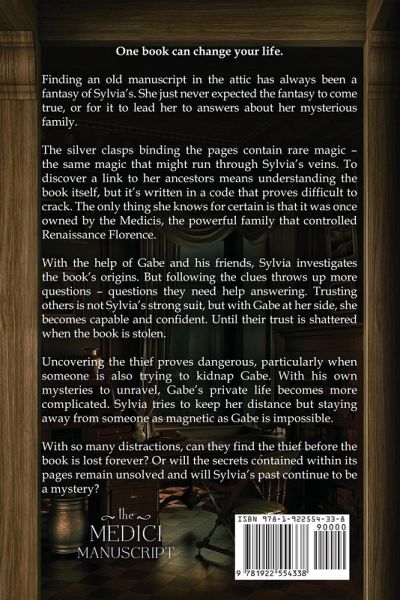 One book can change your life. Finding an old manuscript in the attic has always been a fantasy of Sylvia's. She just never expected the fantasy to come true, or for it to lead her to answers about her mysterious family. The silver clasps binding the pages contain rare magic - the same magic that might run through Sylvia's veins. To discover a link to her ancestors means understanding the book itself, but it's written in a code that proves difficult to crack. The only thing she knows for certain is that it was once owned by the Medicis, the powerful family that controlled Renaissance Florence. With the help of Gabe and his friends, Sylvia investigates the book's origins. But following the clues throws up more questions - questions they need help answering. Trusting others is not Sylvia's strong suit, but with Gabe at her side, she becomes capable and confident. Until their trust is shattered when the book is stolen. Uncovering the thief proves dangerous, particularly when someone is also trying to kidnap Gabe. With his own mysteries to unravel, Gabe's private life becomes more complicated. Sylvia tries to keep her distance but staying away from someone as magnetic as Gabe is impossible. With so many distractions, can they find the thief before the book is lost forever? Or will the secrets contained within its pages remain unsolved and will Sylvia's past continue to be a mystery?