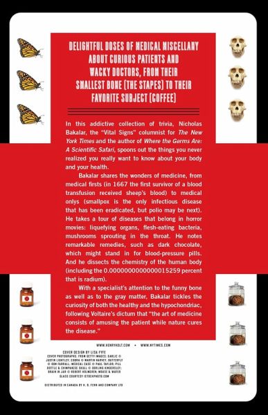 Delightful doses of medical miscellany about wacky doctors and their curious patients, from their smallest bones (the stapes) to their heaviest organs (the liver) In this addictive collection of trivia, Nicholas Bakalar, the "Vital Signs" columnist for The New York Times, spoons out the things you never realized you really want to know about your body and your health. Bakalar shares the wonders of medicine, from medical firsts (in 1667, the first survivor of a blood transfusion received sheep's blood) to medical onlys (rabies is the only infectious disease that is 100 percent curable when treated and 100 percent fatal if not). He takes a tour of diseases that belong in horror movies: liquefying organs, flesh-eating bacteria, mushrooms sprouting in the throat. He notes remarkable remedies, such as dark chocolate, which can stand in for blood-pressure pills. And he dissects the chemistry of the human body (including the 0.0000000000000015259 percent that is radium). With a specialist's attention to the funny bone as well as the gray matter, Bakalar's The Medicine Cabinet of Curiosities tickles the curiosity of both the healthy and the hypochondriac, following Voltaire's dictum that "the art of medicine consists of amusing the patient while nature cures the disease."