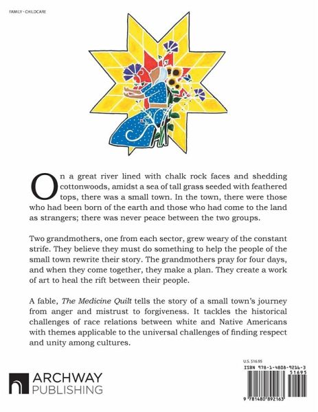 On a great river lined with chalk rock faces and shedding cottonwoods, amidst a sea of tall grass seeded with feathered tops, there was a small town. In the town, there were those who had been born of the earth and those who had come to the land as strangers; there was never peace between the two groups. Two grandmothers, one from each sector, grew weary of the constant strife. They believe they must do something to help the people of the small town rewrite their story. The grandmothers pray for four days, and when they come together, they make a plan. They create a work of art to heal the rift between their people. A fable, The Medicine Quilt tells the story of a small town's journey from anger and mistrust to forgiveness. It tackles the historical challenges of race relations between white and Native Americans with themes applicable to the universal challenges of finding respect and unity among cultures.