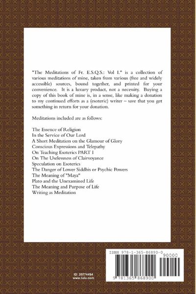 "The Meditations of Fr. E.S.Q.S.: Vol I." is a collection of various meditations of mine, taken from various (free and widely accessible) sources, bound together, and printed for your convenience. It is a luxury product, not a necessity. Buying a copy of this book of mine is, in a sense, like making a donation to my continued efforts as a (esoteric) writer - save that you get something in return for your donation. Meditations included are as follows: The Essence of Religion In the Service of Our Lord A Short Meditation on the Glamour of Glory Conscious Expressions and Telepathy On Teaching Esoterics PART I On The Uselessness of Clairvoyance Speculation on Esoterics The Danger of Lower Siddhis or Psychic Powers The Meaning of "Maya" Plato and the Unexamined Life The Meaning and Purpose of Life Writing as Meditation