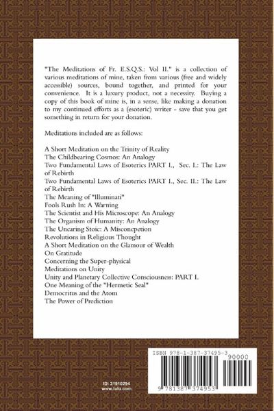 "The Meditations of Fr. E.S.Q.S.: Vol II." is a collection of various meditations of mine, taken from various (free and widely accessible) sources, bound together, and printed for your convenience. It is a luxury product, not a necessity. Buying a copy of this book of mine is, in a sense, like making a donation to my continued efforts as a (esoteric) writer - save that you get something in return for your donation.