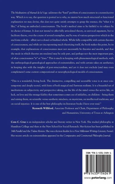 The Meditations of Manuel de la Vega addresses the "hard" problem of consciousness in a nonreductive way. Which is to say, the question is posited as to why, no matter how much structural or functional explanation we may devise, this does not quite satisfy attempts to grasp the essence, the "what it is like," of being an embodied consciousness. The book's method aims to be faithful to its subject by its choice of format. It does not intend to offer fully articulated theory, as univocal argument, but to facilitate theory, over the course of several exemplars, and by way of various perspectives which in the end form a whole-albeit not a closed or finalized whole. While fully compatible with certain theories of consciousness, and while yet incorporating much theorizing itself, the book makes the point, by its example, that explanations of consciousness must not necessarily be theories and models, and that the mode in which theories are rendered may be only part, and perhaps not the most important part, of what consciousness "is" or "does." This is much in keeping with phenomenological methods, with the anthropological-genealogical approaches of existentialists, and with certain takes on aesthetics; in keeping also with the insights of post-structuralism, and yet it does not exclude (and may even complement) some current computational or neurophysiological models of consciousness.