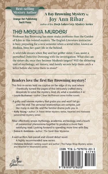 Professor Bay Browning has more snake problems than the Garden of Eden in this twisted mystery. The English Literature instructor is busy preparing for a new semester when a serial killer, known as Medusa, bites her quiet life in the behind. A wild ride ensues when Bay and her grifter sister, Cass, assist a perturbed Detective Downing with the investigation. What else can the sisters do, once they become Medusa's targets? Will the slithering trail of mythology, art history, and family secrets help them catch a killer before she turns them to stone?