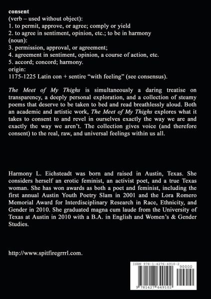 The Meet of My Thighs is simultaneously a daring treatise on transparency, a deeply personal exploration, and a collection of steamy poems that deserve to be taken to bed and read breathlessly aloud. Both an academic and artistic work, The Meet of My Thighs explores what it takes to consent to and revel in ourselves exactly the way we are and exactly the way we aren't. The collection gives voice (and therefore consent) to the real, raw, and universal feelings within us all.