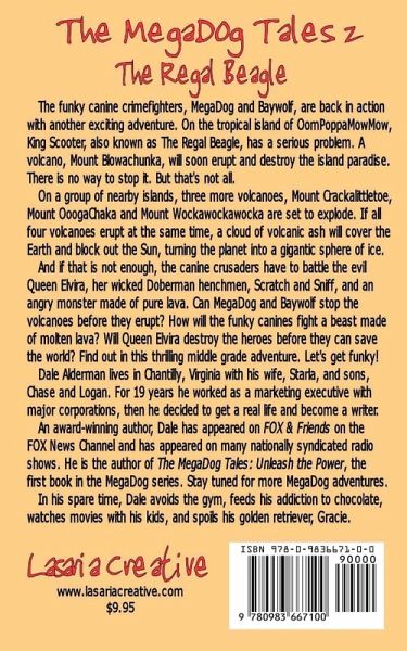 The funky canine crimefighters, MegaDog and Baywolf, are back in action with another exciting adventure. On the tropical island of OomPoppaMowMow, King Scooter, also known as The Regal Beagle, has a serious problem. A volcano, Mount Blowachunka, will soon erupt and destroy the island paradise. There is no way to stop it. But that is not all. On a group of nearby islands, three more volcanoes, Mount Crackalittletoe, Mount OoogaChaka and Mount Wockawockawocka are set to explode. If all four volcanoes erupt at the same time, a cloud of volcanic ash will cover the Earth and block out the Sun, turning the planet into a gigantic sphere of ice. And if that is not enough, the canine crusaders have to battle the evil Queen Elvira, her wicked Doberman henchmen, Scratch and Sniff, and an angry monster made of pure lava. Can MegaDog and Baywolf stop the volcanoes before they erupt? How will the funky canines fight a beast made of molten lava? Will Queen Elvira destroy the heroes before they can save the world? Find out in this exciting middle grade adventure. Time to get funky! Dale Alderman lives in Chantilly, Virginia with his wife, Starla, and sons, Chase and Logan. For 19 years he worked as a marketing executive with major corporations, then he decided to get a real life and become a writer. An award-winning author, Dale has appeared on FOX & Friends on the FOX News Channel and has appeared on many nationally syndicated radio shows. He is the author of The MegaDog Tales: Unleash the Power, the first book in the MegaDog series. Stay tuned for more MegaDog adventures. In his spare time, Dale avoids going to the gym, feeds his addiction to chocolate, watches movies with his kids, and spoils his golden retriever, Gracie. For more information about Dale, go to www.lasariacreative.com.