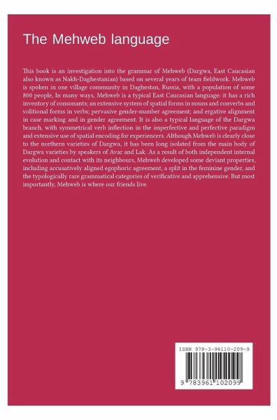 This book is an investigation into the grammar of Mehweb (Dargwa, East Caucasian also known as Nakh-Daghestanian) based on several years of team fieldwork. Mehweb is spoken in one village community in Daghestan, Russia, with a population of some 800 people, In many ways, Mehweb is a typical East Caucasian language: it has a rich inventory of consonants; an extensive system of spatial forms in nouns and converbs and volitional forms in verbs; pervasive gender-number agreement; and ergative alignment in case marking and in gender agreement. It is also a typical language of the Dargwa branch, with symmetrical verb inflection in the imperfective and perfective paradigm and extensive use of spatial encoding for experiencers. Although Mehweb is clearly close to the northern varieties of Dargwa, it has been long isolated from the main body of Dargwa varieties by speakers of Avar and Lak. As a result of both independent internal evolution and contact with its neighbours, Mehweb developed some deviant properties, including accusatively aligned egophoric agreement, a split in the feminine class, and the typologically rare grammatical categories of verificative and apprehensive. But most importantly, Mehweb is where our friends live.