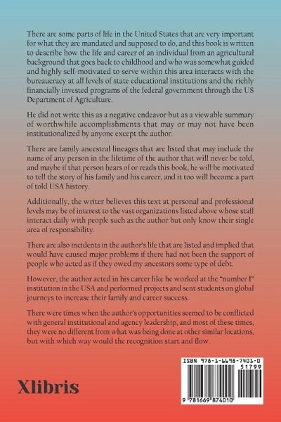 There are some parts of life in the United States that are very important for what they are mandated and supposed to do, and this book is written to describe how the life and career of an individual from an agricultural background that goes back to childhood and who was somewhat guided and highly self-motivated to serve within this area interacts with the bureaucracy at all levels of state educational institutions and the richly financially invested programs of the federal government through the US Department of Agriculture. He did not write this as a negative endeavor but as a viewable summary of worthwhile accomplishments that may or may not have been institutionalized by anyone except the author. There are family ancestral lineages that are listed that may include the name of any person in the lifetime of the author that will never be told, and maybe if that person hears of or reads this book, he will be motivated to tell the story of his family and his career, and it too will become a part of told USA history. Additionally, the writer believes this text at personal and professional levels may be of interest to the vast organizations listed above whose staff interact daily with people such as the author but only know their single area of responsibility. There are also incidents in the author's life that are listed and implied that would have caused major problems if there had not been the support of people who acted as if they owed my ancestors some type of debt. However, the author acted in his career like he worked at the "number 1" institution in the USA and performed projects and sent students on global journeys to increase their family and career success. There were times when the author's opportunities seemed to be conflicted with general institutional and agency leadership, and most of these times, they were no different from what was being done at other similar locations, but with which way would the recognition start and flow.
