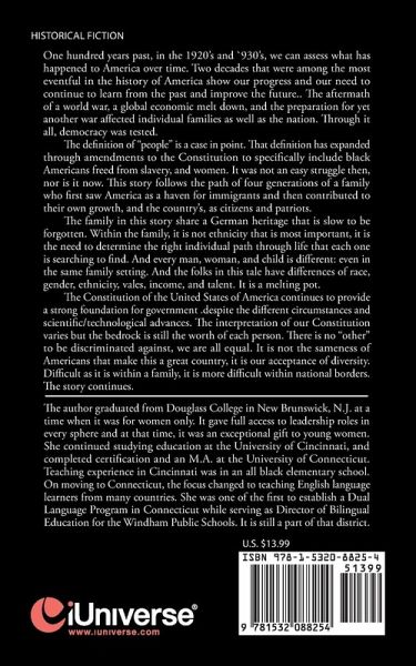 One hundred years past, in the 1920's and `930's, we can assess what has happened to America over time. Two decades that were among the most eventful in the history of America show our progress and our need to continue to learn from the past and improve the future.. The aftermath of a world war, a global economic melt down, and the preparation for yet another war affected individual families as well as the nation. Through it all, democracy was tested. The definition of "people" is a case in point. That definition has expanded through amendments to the Constitution to specifically include black Americans freed from slavery, and women. It was not an easy struggle then, nor is it now. This story follows the path of four generations of a family who first saw America as a haven for immigrants and then contributed to their own growth, and the country's, as citizens and patriots. The family in this story share a German heritage that is slow to be forgotten. Within the family, it is not ethnicity that is most important, it is the need to determine the right individual path through life that each one is searching to find. And every man, woman, and child is different: even in the same family setting. And the folks in this tale have differences of race, gender, ethnicity, vales, income, and talent. It is a melting pot. The Constitution of the United States of America continues to provide a strong foundation for government .despite the different circumstances and scientific/technological advances. The interpretation of our Constitution varies but the bedrock is still the worth of each person. There is no "other" to be discriminated against, we are all equal. It is not the sameness of Americans that make this a great country, it is our acceptance of diversity. Difficult as it is within a family, it is more difficult within national borders. The story continues.