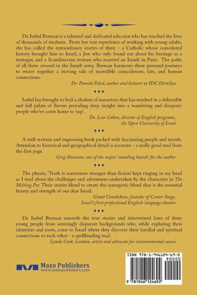 The Melting Pot: A Tale of Three Citizens is a uniquely-written historical novel of three unrelated people - until their lives become quite related. The author, Isabel Berman, blends her captivating novel through Jewish ritual and Israeli history. She has woven the fictionalized accounts of the Aliyah (immigration to Israel) of two former students and a longtime friend - a Catholic whose convoluted history brought him to Israel, a Jew who only found out about his heritage as a teenager, and a Scandinavian woman who married an Israeli in Paris. The paths of all three crossed in the Israeli army; Berman harnesses these personal journeys to weave together a moving tale of incredible coincidences, fate, and human connections. All three of their stories are quite remarkable and intersect in the way that David Ben Gurion defined the Israeli melting pot - through the Israeli army, the IDF.