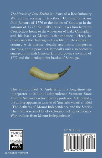 The Memoirs of Issac Kendall is a fictionalized diary of a Revolutionary War soldier serving in Northern Continental Army from January of 1776 to the battles of Saratoga in the autumn of 1777. Kendall's service takes him from his Connecticut home to the wilderness of Lake Champlain and his base at Mount Independence. Here, he experiences the challenges of a soldier of the eighteenth century with disease, deadly accidents, dangerous environs, and a poor diet. Kendall's unit also becomes engaged in British General John Burgoyne's invasion of 1777 and the turning-point battles of Saratoga.