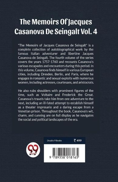 "The Memoirs of Jacques Casanova de Seingalt" is a complete collection of autobiographical work by the famous Italian adventurer and libertine Jacques Casanova de Seingalt. The fourth volume of the series covers the years 1757-1760 and recounts Casanova's various escapades and encounters during this period. In this volume, Casanova finds himself in various European cities, including Dresden, Berlin, and Paris, where he engages in romantic and sexual exploits with numerous women, including actresses, courtesans, and aristocrats. He also rubs shoulders with prominent figures of the time, such as Voltaire and Frederick the Great. Casanova's travels take him from one adventure to the next, including an ill-fated attempt to establish himself as a theater impresario and a daring escape from a Venetian prison. Throughout the book, Casanova's wit, charm, and cunning are on full display as he navigates the social and political landscapes of the era.