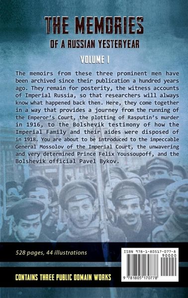 First Edition: Trim 6.14" x 9.21" Hardback, Black & White, Cream paper, Gloss cover. 528 pages. Within these covers there are three great Public Domain works: 1) Alexander Mossolov was the head of the Court Chancellery of Tsar Nicholas II. He was the Second in Commend to Count Woldemar Freedericksz the Chief Marshal of the Court and trusted friend to the Imperial Couple. Mossolov gives a detailed account of life at the Court and and the ways of the Imperial Couple. 2) Felix Youssoupoff was the heir of the richest aristocratic family in Russia, who went to Oxford for his studies where he first met Oswald Rayner, the future British SIS (i.e. MI6) agent in Russia. Youssoupoff is famed for arranging and performing the murder of Rasputin. This is his account of how he planned and actioned the heinous plot. 3) Pavel Bykov was a Russian military official who not only came to appreciate the revolution but became an ardent Bolshevik. His book was banned in Russia but on he continent became the first admission to the killings of the ex-Imperial Family and their aides. Bykov describes the dastardly deed in detail and the disposal of the bodies. Decades later, clues from this book were used to help locate the graves.