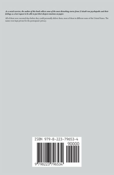 As a social exercise, the author of this book collects some of the most disturbing stories from 21 death row psychopaths and their feelings as a last request to be able to put their deepest emotions on paper. All of them were executed days before they could personally deliver them, most of them in different states of the United States. The names were kept private for the participants' privacy.