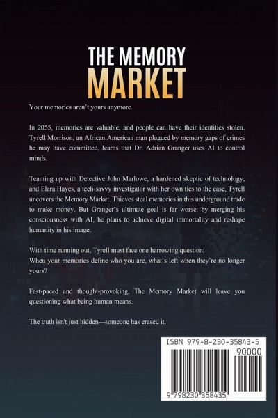 The Memory Market Your memories aren't yours anymore. In 2055, memories are currency, identities are stolen, and minds are rewritten. Tyrell Morrison is haunted by fragments of crimes he never committed-at least, not that he remembers. His search for the truth leads him to a horrifying discovery: he's been manipulated by Dr. Adrian Granger, a mad genius using AI to erase identities and control humanity. As Tyrell's sense of self unravels, he teams up with Detective John Marlowe, a grizzled skeptic of AI, and Elara Hayes, a tech-savvy investigator with a personal stake in the fight. Together, they uncover the Memory Market: an underground network trading stolen memories for profit and power. But Granger's endgame is far more terrifying. By uploading his consciousness to AI, he plans to achieve digital immortality-and rewrite the world in his image. With time running out, Tyrell must face a chilling question: If your memories make you who you are, what happens when they're no longer yours? Fast-paced, thought-provoking, and utterly unrelenting, The Memory Market is a sci-fi thriller that will leave you questioning what it means to be human. The truth isn't just buried-it's been erased.