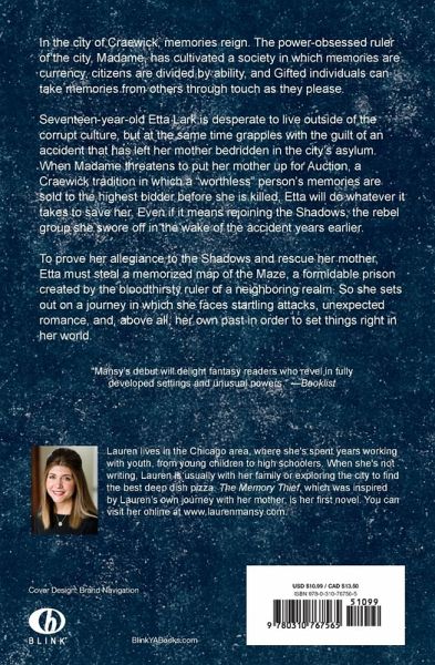 The Memory Thief by author Lauren Mansy brings YA fantasy readers on an unforgettable journey through the city of Craewick---a city where memories are currency, citizens are divided by ability, and â Giftedâ individuals can take memories from others as they please.