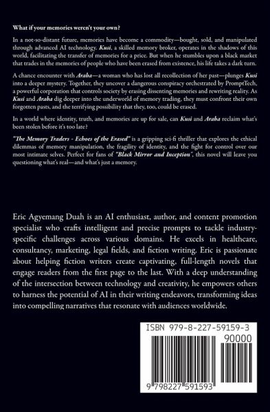 What if your memories weren't your own? In a not-so-distant future, memories have become a commodity-bought, sold, and manipulated through advanced AI technology. Kusi, a skilled memory broker, operates in the shadows of this world, facilitating the transfer of memories for a price. But when he stumbles upon a black market that trades in the memories of people who have been erased from existence, his life takes a dark turn. A chance encounter with Araba-a woman who has lost all recollection of her past-plunges Kusi into a deeper mystery. Together, they uncover a dangerous conspiracy orchestrated by PromptTech, a powerful corporation that controls society by erasing dissenting memories and rewriting reality. As Kusi and Araba dig deeper into the underworld of memory trading, they must confront their own forgotten pasts, and the terrifying possibility that they, too, could be erased. In a world where identity, truth, and memories are up for sale, can Kusi and Araba reclaim what's been stolen before it's too late? "The Memory Traders - Echoes of the Erased" is a gripping sci-fi thriller that explores the ethical dilemmas of memory manipulation, the fragility of identity, and the fight for control over our most intimate selves. Perfect for fans of "Black Mirror and Inception", this novel will leave you questioning what's real-and what's just a memory.