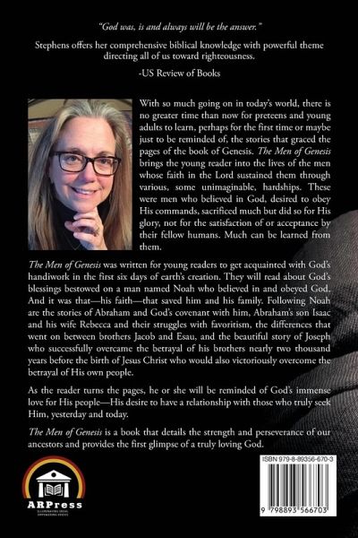 With so much going on in today's world, there is no longer greater time than now for preteens and young adults to learn, perhaps for the first time or maybe just to be reminded of, the stories that graced the pages of the book of Genesis. The Men of Genesis brings the young reader into the lives of the men whose faith in the Lord sustained them through various, some unimaginable, hardships. these were men who believed in God, desired to obey His commands, sacrificed much but did so for His glory, not for the satisfaction of or acceptance by their fellow humans. Much can be learned from them. The Men of Genesis was written for young readers to get acquainted with God's handiwork in the first six days of earth's creation. They will read about God's blessings bestowed on a man named Noah who believed in and obeyed God. And it was that-his faith-that saved him and his family. Following Noah are the stories of Abraham and God's covenant with him, Abraham's son Isaac and his wife Rebecca and their struggles with favoritism, the difference that went on between brothers Jacob and Esau, and the beautiful story of Joseph who successfully overcame the betrayal of his brothers nearly two thousand years before the birth of Jesus Christ who would also victoriously overcome the betrayal of His own people. As the reader turns the pages, he or she will be reminded of God's immense love for His people-His desire to have a relationship with those who truly seek Him, yesterday and today. The Men of Genesis is a book that details the strength and perseverance of our ancestors and provides the first glimpse of a truly loving God.