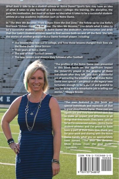 What does it take to be a student-athlete at Notre Dame? Sports fans may have an idea of what it takes to play football at a Division I college: the training, the discipline, the pain, the motivation. But most of us have no idea what it takes to be a successful student-athlete at a top academic institution such as Notre Dame. In "The Men We Became: More Echoes From the End Zone," the follow up to Lisa Kelly's first book "Echoes From the End Zone: The Men We Became;" Lisa details what it takes to be a successful student-athlete at Notre Dame: the dedication, determination and drive that Our Lady's student-athletes need to find success both on and off the field. She tells the stories of another group of Notre Dame football players including: ¿ The lessons they learned in college, and how those lessons changed their lives via the Notre Dame Value Stream. . ¿ Their years at Notre Dame. . ¿ The end of their football careers. . ¿ The new careers and dreams they followed after football.