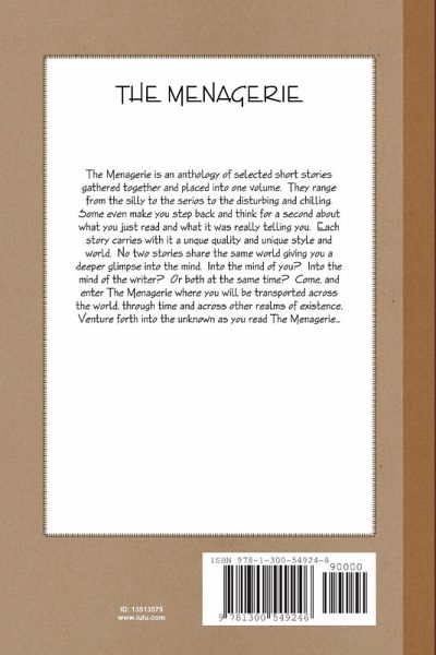 The Menagerie is a collection of short stories that have been carefully and thoughtfully put together into a single volume. The stories range from the serious and thought provoking to action and adventure, through space and time and even some horror and science fiction. No two stories are the same in style or theme. It is the first work that has been published by me and I hope everyone who gets a copy thoroughly enjoys reading it and tells others about the book.