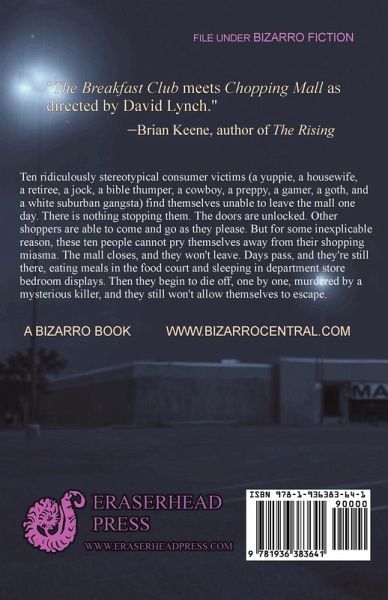 Ten ridiculously stereotypical consumer victims (a yuppie, a housewife, a retiree, a jock, a bible thumper, a cowboy, a preppy, a gamer, a goth, and a white suburban gangsta) find themselves unable to leave the mall one day. There is nothing stopping them. The doors are unlocked. Other shoppers are able to come and go as they please. But for some inexplicable reason, these ten people cannot pry themselves away from their shopping miasma. The mall closes, and they won't leave. Days pass, and they're still there, eating meals in the food court and sleeping in department store bedroom displays. Then they begin to die off, one by one, murdered by a mysterious killer, and they still won't allow themselves to escape.