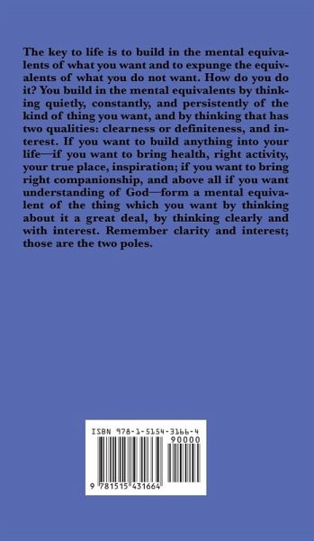The key to life is to build in the mental equivalents of what you want and to expunge the equivalents of what you do not want. How do you do it? You build in the mental equivalents by thinking quietly, constantly, and persistently of the kind of thing you want, and by thinking that has two qualities: clearness or definiteness, and interes
