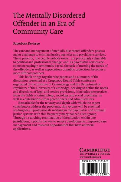 The care and management of mentally disordered offenders poses a major challenge to criminal justice agencies and psychiatric services. These patients, 'the people nobody owns', are particularly vulnerable to political and professional change and as psychiatric services become increasingly community-based, the task of meeting the needs of the offender, as well as expectations of public protection, becomes a more difficult prospect. This book brings together the papers and a summary of the discussion presented at a Cropwood Round Table conference organized by the Institute of Criminology and the Department of Psychiatry of the University of Cambridge. Seeking to define future needs and directions in legal and service provisions, it includes perspectives from the fields of criminology, sociology and social psychiatry, and contributions from practitioners and administrators. Remarkable for the tenacity and depth with which the expert contributors address the problems, this is essential reading for all professionals working in the psychiatric and criminal justice systems with this frequently marginalized client group. Through a searching examination of the situation within one jurisdiction it points the way to service developments, improved care management and research opportunities that have universal applications.