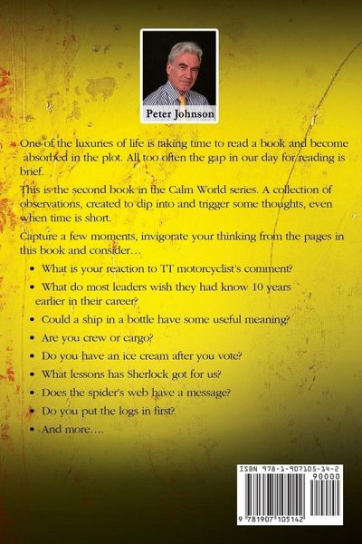 One of the luxuries of life is taking time to read a book and become absorbed in the plot. All too often the gap in our day for reading is brief. This is the second book in the Calm World series. A collection of observations, created to dip into and trigger some thoughts, even when time is short. Capture a few moments, invigorate your thinking from the pages in this book and consider... * What is your reaction to TT motorcyclist's comment? * What do most leaders wish they had know 10 years earlier in their career? * Could a ship in a bottle have some useful meaning? * Are you crew or cargo? * Do you have an ice cream after you vote? * What lessons has Sherlock got for us? * Does the spider's web have a message? * Do you put the logs in first? * And more....
