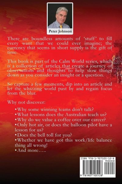 There are boundless amounts of 'stuff' to fill every want that we could ever imagine; the currency that seems in short supply is the gift of time. This book is part of the Calm World series, which is a collection of articles that create a journey of observations and thoughts to help slow things down as you consider an insight or a question. So capture a few moments, dip into an article and let the whizzing world past by and regain focus from the blur. Why not discover: Why some winning teams don't talk? What lessons does the Australian teach us? Why do we value a coffee over our career? Only hot air, or does the balloon pilot have a lesson for us? Does the bell toll for you? Whether we have got this work/life balance thing all wrong! And more…..