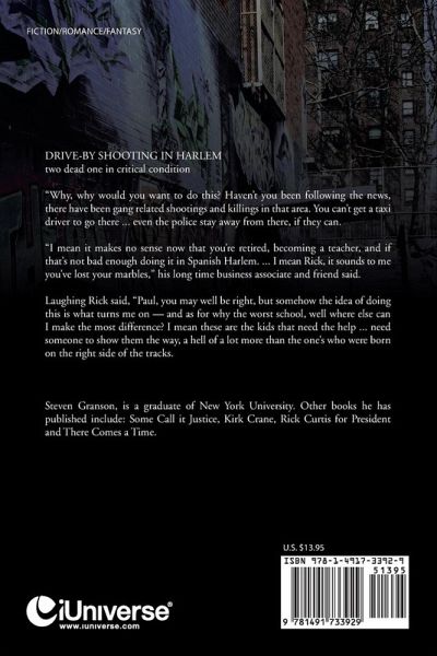 DRIVE-BY SHOOTING IN HARLEM two dead one in critical condition "Why, why would you want to do this? Haven't you been following the news, there have been gang related shootings and killings in that area. You can't get a taxi driver to go there ... even the police stay away from there, if they can. "I mean it makes no sense now that you're retired, becoming a teacher, and if that's not bad enough doing it in Spanish Harlem. ... I mean Rick, it sounds to me you've lost your marbles," his long time business associate and friend said. Laughing Rick said, "Paul, you may well be right, but somehow the idea of doing this is what turns me on - and as for why the worst school, well where else can I make the most difference? I mean these are the kids that need the help ... need someone to show them the way, a hell of a lot more than the one's who were born on the right side of the tracks.