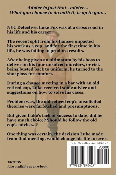 NYC Detective, Luke Fox was at a cross road in his life and his career. The recent split from his fiancée impacted his work as a cop, and for the first time in his life, he was failing to produce results. After being given an ultimatum by his boss to deliver on his four unsolved murders, or risk being busted back to uniform, he turned to the shot glass for comfort. During a chance meeting in a bar with an old retired cop, Luke received some advice and suggestions on how to solve his cases. Problem was, the old retired cop's unsolicited theories were farfetched and presumptuous. But given Luke's lack of success to date, did he have much choice? Should he follow the old cop's advice...? One thing was certain, the decision Luke made from that meeting would change his life forever.