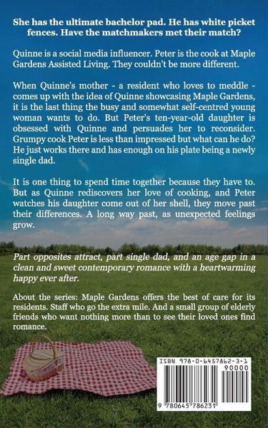She has the ultimate bachelor pad. He has white picket fences. A matchmaker's dream? Or nightmare! Quinne is a social media influencer. Peter is the cook at Maple Gardens Assisted Living. They couldn't be more different. When Quinne's mother - a resident who loves to meddle - comes up with the idea of Quinne showcasing Maple Gardens, it is the last thing the busy and somewhat self-centred young woman wants to do. But Peter's ten-year-old daughter is obsessed with Quinne and persuades her to reconsider. Grumpy cook Peter is less than impressed but what can he do? He just works there and has enough on his plate being a newly single dad. It is one thing to spend time together because they have to. But as Quinne rediscovers her love of cooking, and Peter watches his daughter come out of her shell, they move past their differences. A long way past, as unexpected feelings grow. But when the fallout from an accident reminds them just how different they are, will the matchmaking skills of the Maple Gardens residents be enough to bring together this unlikely pair? Part opposites attract, part single dad, and an age gap... all wrapped up in a clean and sweet contemporary romance with a heartwarming happy ever after. About the series: Maple Gardens has the best of care for its residents. Staff who go the extra mile. And a small group of elderly friends who want nothing more than to see their loved ones find romance. Even if it takes a bit of a nudge sometimes. And a whole lot of meddling!