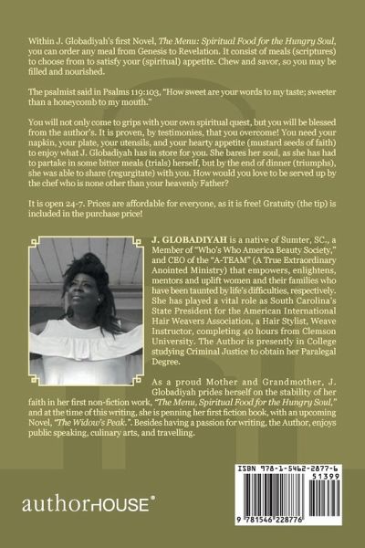 Within J. Globadiyahs first Novel, The Menu: Spiritual Food for the Hungry Soul, you can order any meal from Genesis to Revelation. It consist of meals (scriptures) to choose from to satisfy your (spiritual) appetite. Chew and savor, so you may be filled and nourished. The psalmist said in Psalms 119:103, How sweet are your words to my taste; sweeter than a honeycomb to my mouth. You will not only come to grips with your own spiritual quest, but you will be blessed from the authors. It is proven, by testimonies, that you overcome! You need your napkin, your plate, your utensils, and your hearty appetite (mustard seeds of faith) to enjoy what J. Globadiyah has in store for you. She bares her soul, as she has had to partake in some bitter meals (trials) herself, but by the end of dinner (triumphs), she was able to share (regurgitate) with you. How would you love to be served up by the chef who is none other than your heavenly Father? It is open 24-7. Prices are affordable for everyone, as it is free! Gratuity (the tip) is included in the purchase price!