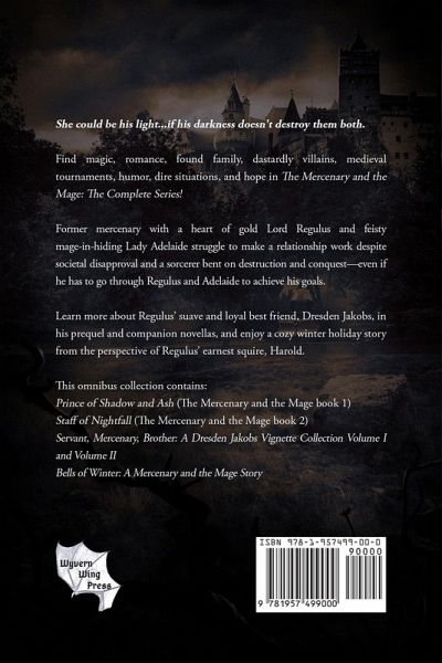 She could be his light...if his darkness doesn't destroy them both. Find magic, romance, found family, dastardly villains, medieval tournaments, humor, dire situations, and hope in The Mercenary and the Mage: The Complete Series! This omnibus contains The Mercenary and the Mage duology, two companion novellas, and a short story in one paperback book. Former mercenary with a heart of gold Lord Regulus and feisty mage-in-hiding Lady Adelaide struggle to make a relationship work despite societal disapproval and a sorcerer bent on destruction and conquest-even if he has to go through Regulus and Adelaide to achieve his goals. Learn more about Regulus' suave and loyal best friend, Dresden Jakobs, in his prequel and companion novellas, and enjoy a cozy winter holiday story from the perspective of Regulus' earnest squire, Harold. Bastard and former mercenary Lord Regulus Hargreaves' resolve is crumbling. He's desperate to pay off his debt to the sorcerer who enslaved him, but after two years, he fears he'll never be free of the cursed mark that won't even let him die. Then Lady Adelaide sees past his scar and shadowed past, and Regulus' dying hope rekindles. But will loving Adelaide while serving the Prince of Shadow and Ash put her in danger? Adelaide Belanger yearns to use the magical energy within her, but revealing her power could get her killed--like every other mage in the kingdom. When she meets kind and rugged Regulus, she wonders if she has finally found someone to trust with her secret-and her heart. Regulus and Adelaide struggle to protect their romance and keep their secrets from predatory nobles and the devious sorcerer. By the time their secrets are revealed, it may be too late for them both...and possibly for the entire kingdom. Contains: Prince of Shadow and Ash (The Mercenary and the Mage book 1) Staff of Nightfall (The Mercenary and the Mage book 2) Companion novellas: Servant, Mercenary, Brother: A Dresden Jakobs Vignette Collection Volume I and Volume II Bells of Winter: A Mercenary and the Mage Story (novelette) All books also available separately. (Content note: Fade-to-black romance, some minor language, bloodshed, thematic material. Possible triggers in series: depression; attempted SA in book two.)