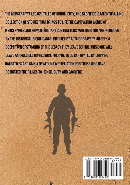 Delve into the captivating world of mercenaries and private military contractors in The Mercenary's Legacy: Tales of Honor, Duty, and Sacrifice. This gripping book unveils the untold stories of these brave men and women who navigate the complex and challenging landscape of modern warfare. Chapter 1 serves as an introduction, providing a comprehensive understanding of mercenaries and private military contractors. Exploring the historical roots of mercenaries, readers will uncover the evolution of these enigmatic figures throughout time. The book also sheds light on the current state of the private military contractor industry, offering valuable insights into its dynamics and significance in today's world. In Chapter 2, readers are granted a glimpse into the life of a mercenary. From the initial recruitment and rigorous training processes to deployment and the harsh realities of combat, this chapter unveils the multifaceted experiences and challenges faced by these individuals. The book delves into their remarkable survival skills and explores the complex transition to post-deployment life, illuminating the sacrifices made in service of their duties. Chapter 3 is a testament to the honor displayed by mercenaries in the field. Through captivating narratives, readers will witness acts of valor, stories of going above and beyond the call of duty, and selfless sacrifices that exemplify the true spirit of honor. Duty is the focal point of Chapter 4, emphasizing the profound sense of responsibility held by mercenaries. The book explores their unwavering dedication to fulfilling missions, loyalty to their country and team, and the ethical dilemmas they often face in the midst of conflict. Through compelling stories, readers gain insight into the significance of duty and its impact on the lives of these brave men and women. Chapter 5 delves into the ultimate sacrifice made by mercenaries-their lives. In honoring the fallen, the book memorializes those who have given everything in the line of duty. Readers will witness the lasting impact on families, communities, and the legacy of sacrifice left behind. This chapter serves as a tribute to the courageous individuals who have paid the highest price for their service. Looking ahead, Chapter 6 explores the future of the mercenary industry. Readers will discover the changes shaping this field, including the evolution of regulations, advancements in technology, and the emerging opportunities and challenges faced by modern mercenaries. This chapter paints a vivid picture of the industry's direction and its implications for the future of warfare. In the final chapter, the book concludes with reflections on the legacy of mercenaries. Drawing upon their historical significance, readers gain valuable insights into the role mercenaries have played throughout history. Lessons learned from their experiences are explored, highlighting the profound impact they have had on society. The book offers a thoughtful examination of the future of mercenaries, leaving readers with a deep appreciation for their enduring legacy. The Mercenary's Legacy: Tales of Honor, Duty, and Sacrifice is an enthralling collection of stories that brings to life the captivating world of mercenaries and private military contractors. Whether you are intrigued by the historical significance, inspired by acts of bravery, or seek a deeper understanding of the legacy they leave behind, this book will leave an indelible impression. Prepare to be captivated by gripping narratives and gain a newfound appreciation for those who have dedicated their lives to honor, duty, and sacrifice.