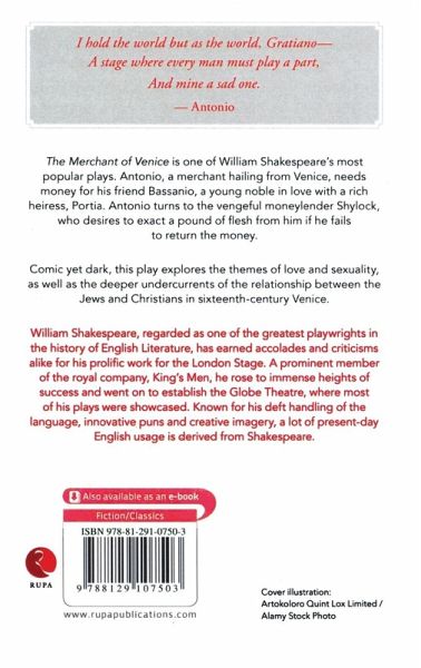 The Merchant of Venice is a play by William Shakespeare, believed to have been written between 1596 and 1598. Although classified as a comedy in the First Folio, and while it shares certain aspects with Shakespeare's other romantic comedies, the play is perhaps more remembered for its dramatic scenes, and is best known for the character of Shylock.The title character is the merchant Antonio, not the Jewish moneylender Shylock, who is the play's most prominent and more famous villain. Though Shylock is a tormented character, he is also a tormentor, so whether he is to be viewed with disdain or…mehr