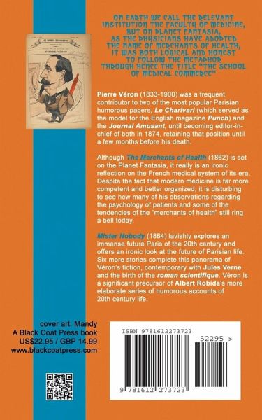 Pierre Véron (1833-1900) was a frequent contributor to two of the most popular Parisian humorous papers, Le Charivari (which served as the model for the English magazine Punch) and the Journal Amusant, until becoming editor-in-chief of both in 1874, retaining that position until a few months before his death. Although The Merchants of Health (1862) is set on the Planet Fantasia, it really is an ironic reflections on the French medical system of its era. Despite the fact that modern medicine is far more competent and better organized, it is disturbing to see how many of his observations regarding the psychology of patients and some of the tendencies of the "merchants of health" still ring a bell today. Mister Nobody (1864) lavishly explores an immense future Paris of the 20th century and offers an ironic look at the future of Parisian life. Six more stories complete this panorama of Véron's fiction, contemporary with Jules Verne the birth of the roman scientifique. Véron is a significant precursor of Albert Robida's more elaborate series of humorous accounts of 20th century life.