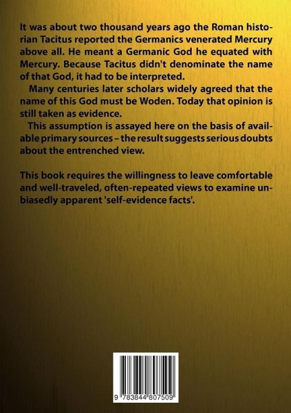 It was about two thousand years ago the Roman historian Tacitus reported the Germanics venerated Mercury above all. He meant a Germanic God he equated with Mercury. Because Tacitus didn't denominate the name of that God, it had to be interpreted. Many centuries later scholars widely agreed that the name of this God must be Woden. Today that opinion is still taken as evidence. This assumption is assayed here on the basis of available primary sources - the result suggests serious doubts about the entrenched view.This book requires the willingness to leave comfortable and well-traveled, often-repeated views to examine unbiasedly apparent 'self-evidence facts'.