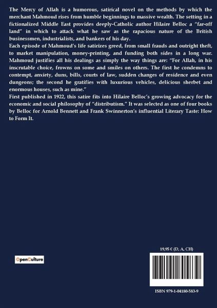 The Mercy of Allah is a humorous, satirical novel on the methods by which the merchant Mahmoud rises from humble beginnings to massive wealth. The setting in a fictionalized Middle East provides deeply-Catholic author Hilaire Belloc a ¿far-off land¿ in which to attack what he saw as the rapacious nature of the British businessmen, industrialists, and bankers of his day. Each episode of Mahmoud¿s life satirizes greed, from small frauds and outright theft, to market manipulation, money-printing, and funding both sides in a long war. Mahmoud justifies all his dealings as simply the way things are: ¿For Allah, in his inscrutable choice, frowns on some and smiles on others. The first he condemns to contempt, anxiety, duns, bills, courts of law, sudden changes of residence and even dungeons; the second he gratifies with luxurious vehicles, delicious sherbet and enormous houses, such as mine.¿ First published in 1922, this satire fits into Hilaire Belloc¿s growing advocacy for the economic and social philosophy of ¿distributism.¿ It was selected as one of four books by Belloc for Arnold Bennett and Frank Swinnerton¿s influential Literary Taste: How to Form It.