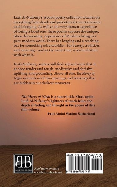 Lutfi Al-Nufoury's second poetry collection touches oneverything from death and parenthood to sectarianismand belonging. As well as the very human experienceof losing a loved one, these poems capture the unique,often disorienting, experience of Muslims living in apost-modern world. There is a longing and a reachingout for something otherworldly-for beauty, tradition,and meaning-and at the same time, a reconciliationwith what is. In Al-Nufoury, readers will find a lyrical voice that is atonce tender and tough, meditative and decisive, upliftingand grounding. Above all else, The Mercy of Night remindsus of the openings and blessings that are hiddenin our darkest moments.