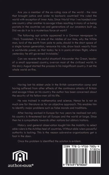 Are you a member of the ex-ruling race of the world - the race that brought justice and order to barbaric countries? We ruled the world with exception of inner Asia. Since World War I we handed over one country after another to savage tribes resulting in many of us being pariahs in the countries we and generations of our ancestors built up. Did we do it or is a mysterious force at work? The following apt article appeared in a German newspaper in 1960. Translated: "It is one of the riddles of our time, why the White man, lord of the earth from pole to pole, should in the short space of a single human generation, renounce his rule, draw back wearily from a worldwide power, so that today he is in panic-stricken flight, where yesterday he still governed inviolable." Can we reverse this awful situation? Alexander the Great, leader of a small oppressed country, overran most of the civilized world. In this story August started the process in his insignificant country. It set the whole world on fire.